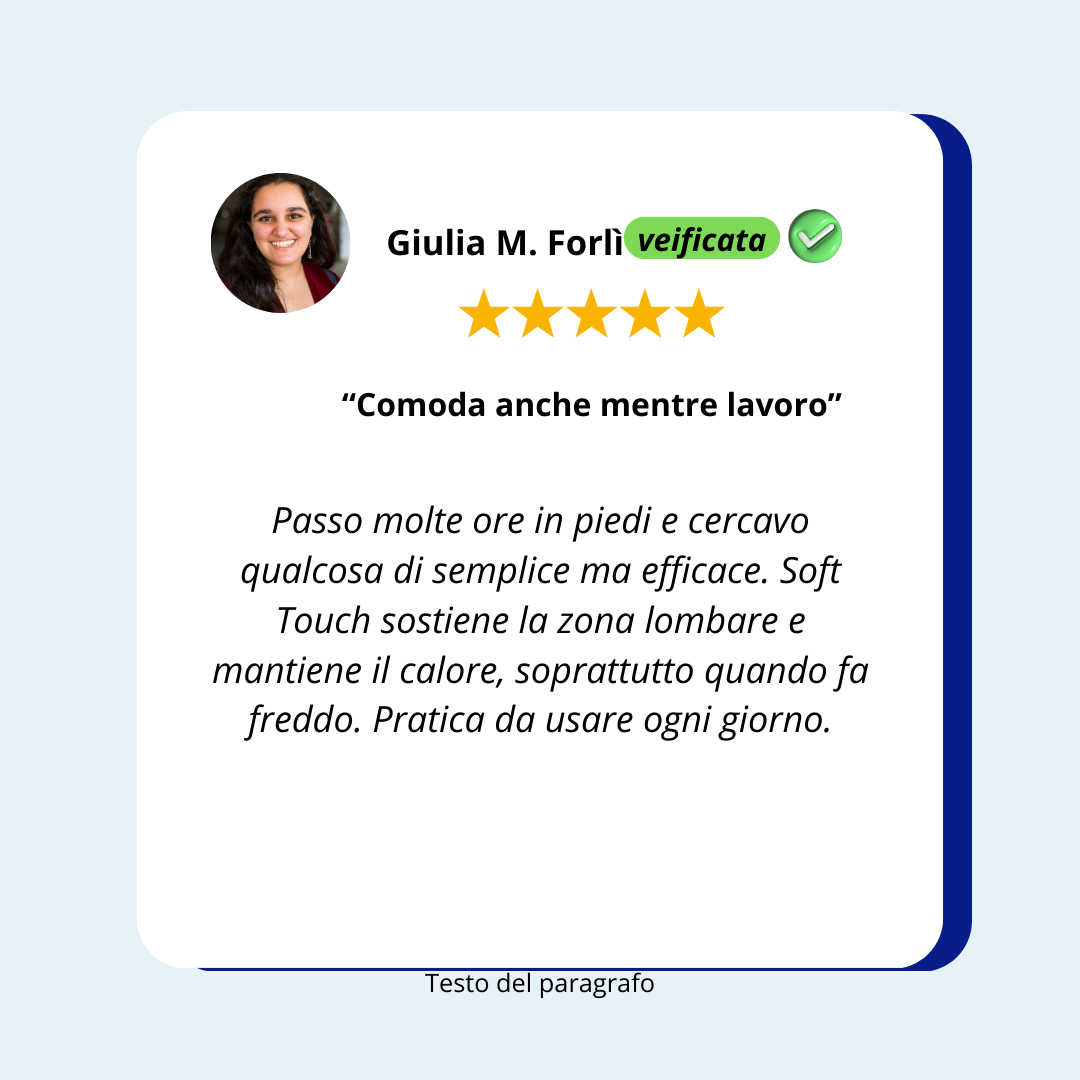 Soft Touch si attiva con il calore naturale del tuo corpo e accompagna la schiena con una sensazione di comfort continuo, discreto e profondo, durante tutta la giornata.