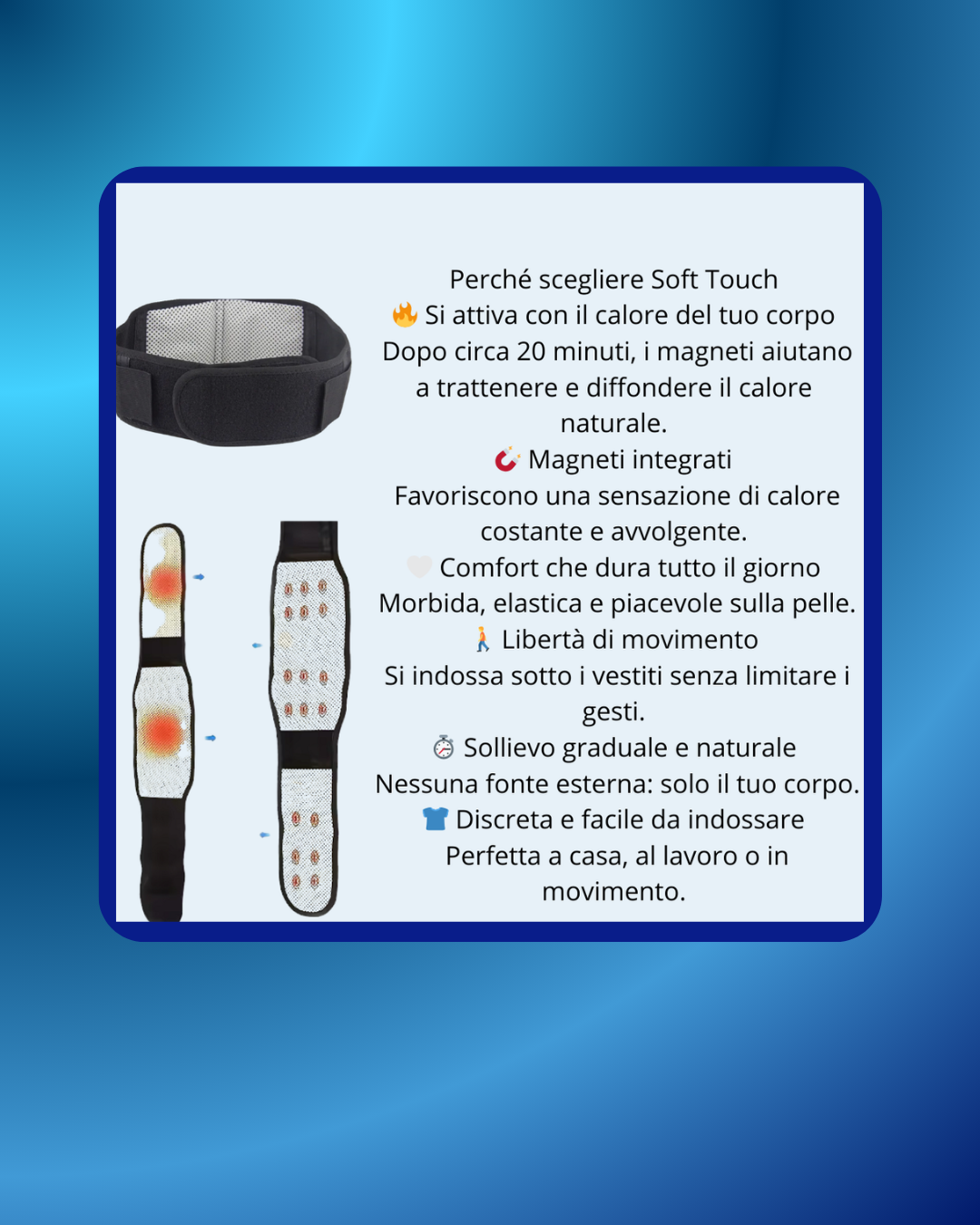 Soft Touch è una fascia lombare con tormalina e tecnologia magnetica integrata, progettata per favorire una sensazione di calore naturale e continuo nella zona bassa della schiena.